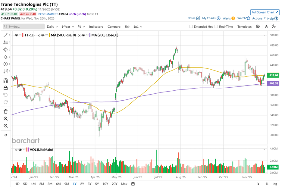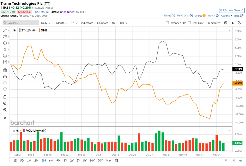 TT shares currently trade about 11.9% below their July high of $476.18. However, over the past three months, the stock has slipped nearly 1.5%, a milder pullback compared with the SPDR S&P Homebuilders ETF (XHB), which declined 5% in the same period.