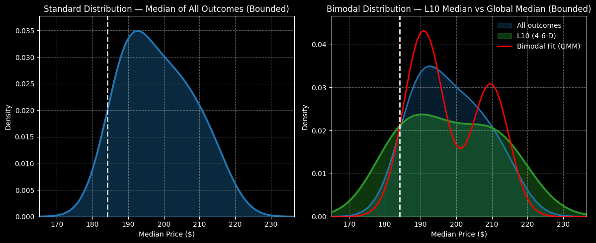 Specifically, the range of outcomes expands to $160 and $240. However, the beauty of the Markovian second-order analysis comes in the form of probability density. Under 4-6-D conditions, density will be greatest between $183 and $211. Under aggregate conditions, density is narrower, landing between $190 and $200.