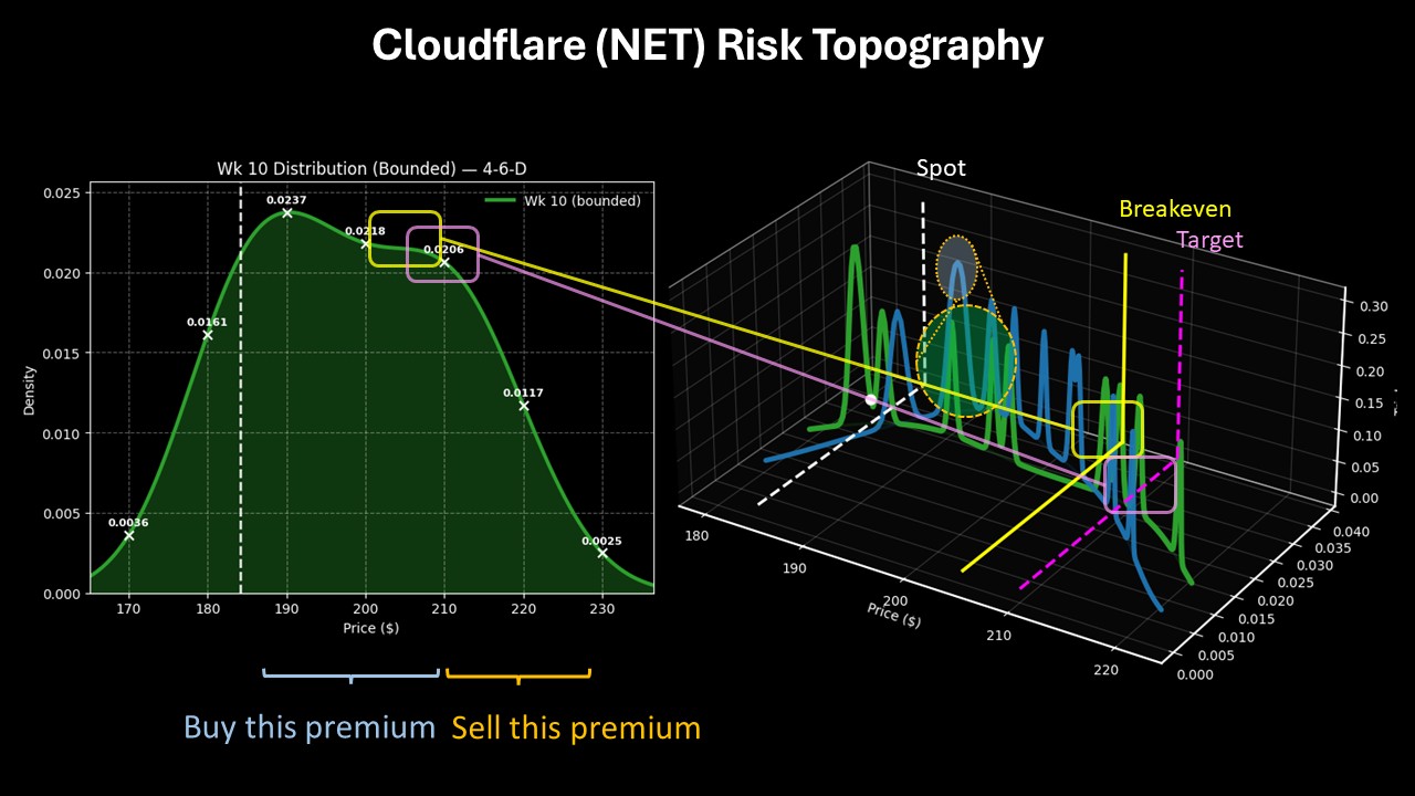 Should NET stock rise through the second-leg strike ($210) at expiration, the maximum profit would be $545, a payout of almost 120%. Breakeven lands at $204.55, adding to the trade’s probabilistic credibility.