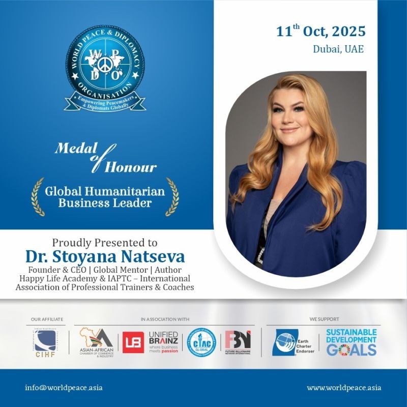 Dr. Stoyana Natseva, founder of Happy Life Academy, has been awarded the prestigious Medal of Honour as Global Humanitarian Business Leader 2025 by the World Peace & Diplomacy Organisation. The award celebrates her profound impact on both global business leadership and humanitarian initiatives.